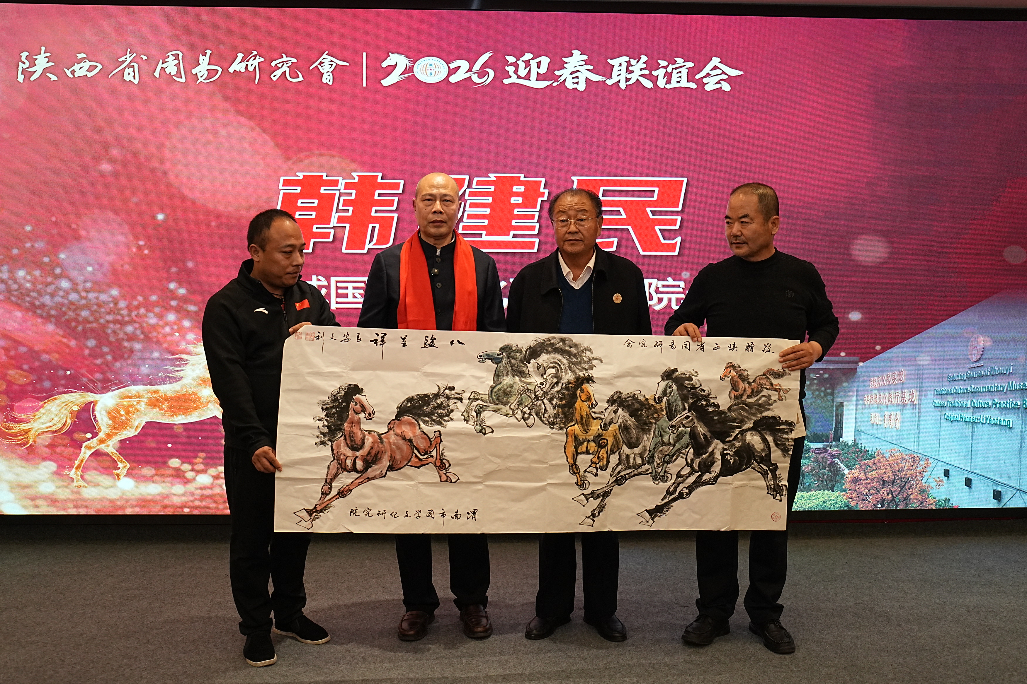 随后,蒲城国学文化研究院韩建民院长向研究会赠送了墨宝《八骏图》,表达了对研究会在马年奋进昂扬、前程万里的美好祝愿。